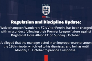 日前,英足總官方發(fā)布公告:“狼隊主帥佩雷拉在10月5日周日對陣布萊頓的英超聯(lián)賽后被指控行為不當(dāng)。據(jù)稱,佩雷拉在第19分鐘左右行為不當(dāng),這導(dǎo)致他被罰下場,他需在10月13日周一前對此作出回應(yīng)。”