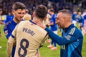 巴薩中場佩德里賽后與皇家奧維耶多40歲中場卡索拉交流,巴薩官方社媒曬出視頻,配文:“兩位球場魔術師。”