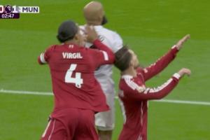 體育資訊10月19日訊 英超第8輪利物浦vs曼聯(lián),曼聯(lián)先進(jìn)一球,第1分鐘姆伯莫破門。進(jìn)球前的爭(zhēng)頂,范迪克爭(zhēng)頂中肘擊麥卡利斯特!