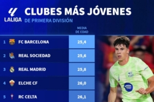 體育資訊9月24日訊 德轉統(tǒng)計了本賽季西甲球隊的平均年齡榜,巴薩平均年齡25.4歲最年輕,皇馬25.8歲第三年輕。