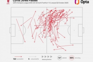 此役柯蒂斯-瓊斯為利物浦踢滿全場,成功傳球122次,這是2003-2004賽季Opta統(tǒng)計相關(guān)數(shù)據(jù)以來,利物浦球員歐冠單場成功傳球紀錄。