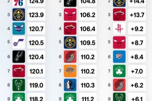 Offensive Rating(進(jìn)攻效率):指的是球隊每100個回合能得到的平均得分。數(shù)值越高,說明球隊進(jìn)攻端越強(qiáng)。