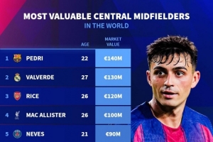 體育資訊11月2日訊 德國轉會市場列出了中場中路球員(Central Midfielders)身價排名,佩德里、巴爾韋德、賴斯前三。