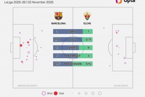 據(jù)OptaJose的數(shù)據(jù)統(tǒng)計(jì),埃爾切是自2005-06賽季以來,首支在西甲聯(lián)賽中對(duì)陣巴薩時(shí),控球率高于對(duì)手的升班馬球隊(duì)。