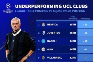 體育資訊11月6日訊 德國(guó)轉(zhuǎn)會(huì)市場(chǎng)根據(jù)球隊(duì)目前歐冠排名與陣容身價(jià)排名的差距,列出了本賽季歐冠表現(xiàn)不佳球隊(duì)榜,本菲卡、尤文最差。