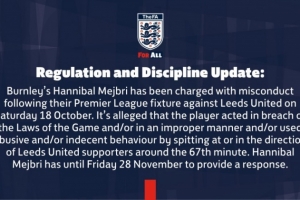 體育資訊11月11日訊 英足總官方消息,伯恩利中場漢尼拔·梅布里因在10月18日對陣?yán)澛?lián)的英超比賽中不當(dāng)行為而被指控。
