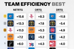 體育資訊11月14日訊 美媒Basketball University發(fā)布了賽季至今的各隊(duì)凈效率、進(jìn)攻效率以及防守效率前十的幫當(dāng)。其中雷霆凈效率+15.6排名第一,進(jìn)攻效率火箭+8.3排名第一,防守效率雷霆-11.8排名第一。