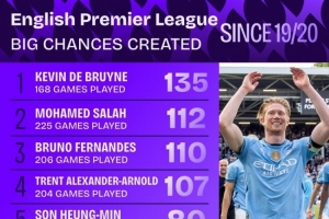 體育資訊11月19日訊 Squawka統(tǒng)計(jì)了2019-2020賽季以來球員在英超創(chuàng)造重大機(jī)會(huì)的次數(shù),并列出榜單,德布勞內(nèi)、薩拉赫、B費(fèi)排名前三位。
