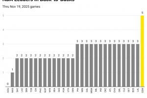 上圖為雅虎記者制作的賽季至今聯(lián)盟的背靠背數(shù)量統(tǒng)計(jì),火箭0個(gè),其他球隊(duì)都是2個(gè)或者3個(gè),勇士5個(gè);