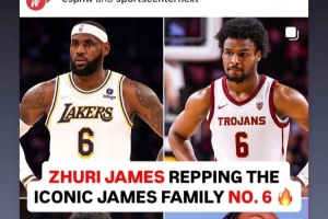 詹姆斯轉(zhuǎn)發(fā)了媒體曬出的他和三個子女都身穿6號球衣的照片。詹姆斯的兩個兒子布朗尼和布萊斯在大學打籃球時都身穿6號球衣,女兒Zhuri在學校打排球時身穿6號球衣。詹姆斯本人在熱火和湖人也有6個賽季身穿6號球衣。