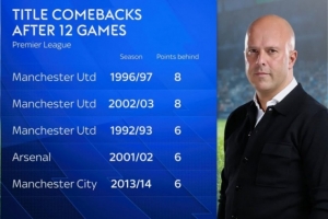 據(jù)天空體育統(tǒng)計(jì),第12輪落后榜首6分或更多最終奪冠,英超歷史只出現(xiàn)過5次這樣的情況。