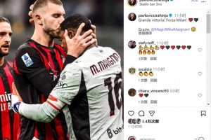 帕夫洛維奇社媒曬出親吻邁尼昂的照片,配文:“偉大的勝利,加油米蘭!謝謝你,邁尼昂?!?/p>