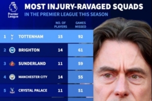 體育資訊11月25日訊 德轉(zhuǎn)列本賽季英超球隊(duì)傷病榜,熱刺15名球員受傷,共計(jì)缺席92場(chǎng)比賽排名第一,布萊頓、桑德蘭位列二三位。