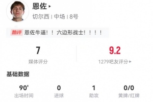 體育資訊11月26日訊 切爾西在本輪歐冠3-0完勝巴薩,恩佐本場數(shù)據(jù)如下: