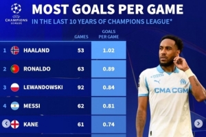 體育資訊11月26日訊 馬賽在本輪歐冠2-1逆轉紐卡斯爾,奧巴梅揚梅開二度。《轉會市場》統(tǒng)計顯示,他也是近10年歐冠場均進球榜前十。