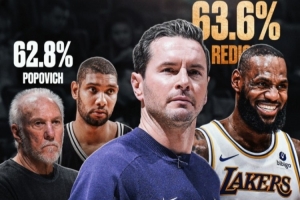 美媒Basketball Forever:雷迪克目前執(zhí)教戰(zhàn)績63勝36負(fù),勝率63.6%高于波波維奇的62.8%(1390勝824負(fù));在雷迪克的帶領(lǐng)下,湖人隊(duì)在前三節(jié)領(lǐng)先的情況下戰(zhàn)績?yōu)?7勝4負(fù),是NBA歷史上最好的戰(zhàn)績。