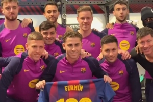 體育資訊11月27日訊 巴薩官推曬視頻,費爾明獲得了俱樂部百場里程碑球衣,并在隊友的簇擁下展示了球衣。
