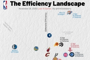 橫軸代表進(jìn)攻效率,越靠右越好,縱軸代表防守效率,越靠上越強(qiáng)。第一象限的球隊(duì)多為發(fā)揮出色的球隊(duì),而在第三象限的球隊(duì)通常為戰(zhàn)績(jī)比較糟糕的球隊(duì)。