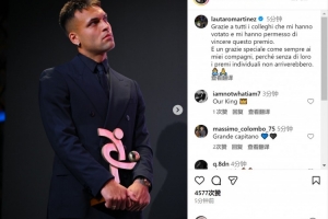 勞塔羅社媒曬出領(lǐng)獎的照片,并寫道:“感謝所有投票支持我的球員,是你們讓我獲得了這個獎項。”