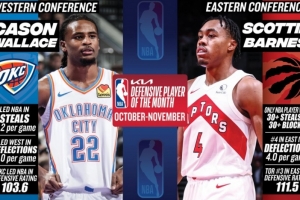 月最佳防守球員:西部卡森·華萊士 東部斯科蒂·巴恩斯!