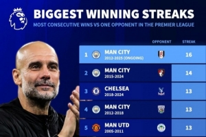 1.曼城 (對富勒姆),2012-2025年 (未終止),16連勝