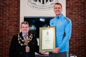 本周,布萊斯市市長戴維·斯溫霍議員前往紐卡斯?fàn)柭?lián)隊(duì)訓(xùn)練基地,為丹·伯恩頒發(fā)了這項(xiàng)殊榮——布萊斯市最高公民獎(jiǎng)——以表彰他在聯(lián)賽杯決賽中為紐卡斯?fàn)柭?lián)做出的卓越貢獻(xiàn)。