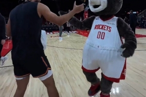 GIF-狄龍賽前和火箭主場(chǎng)的吉祥物打鬧