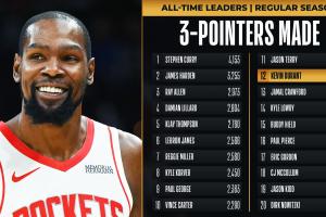 本場比賽,杜蘭特達成兩項里程碑,除了生涯突破31000分外,他的三分命中數(shù)(2223)也超過賈馬爾·克勞福德(2221),獨享歷史第12名。