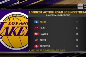 湖人上一次在費城贏球還要追溯到2017年12月7日。