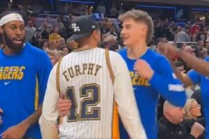 這場比賽,養(yǎng)傷中的哈利伯頓來到場邊觀賽,他身穿隊友弗菲的球衣以示支持,并與弗菲本人互動。