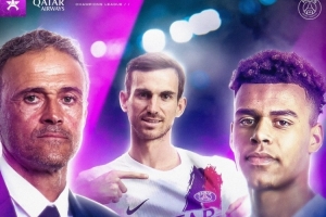 巴黎官方社媒曬出此役的賽前海報(bào),主帥恩里克攜法比安、杜埃出鏡。