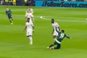 在一次攻防轉(zhuǎn)換回合中,謝爾基拿球先是晃過(guò)了巴爾韋德的鏟搶,隨后將球分出,然而回防的呂迪格一把將其撞倒在地,謝爾基躺在地上攤手一臉困惑。