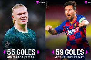 據(jù)統(tǒng)計,25歲的哈蘭德在歐冠已打進55球,26歲前歐冠進球數(shù)僅次于梅西(59球),而哈蘭德明年7月21日才滿26歲。
