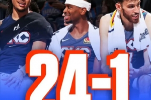 雷霆49分擊潰太陽(yáng),隊(duì)史最高16連勝,24勝1負(fù)開局——輸?shù)哪菆?chǎng)是背靠背,亞歷山大帶哈騰和三替補(bǔ)。