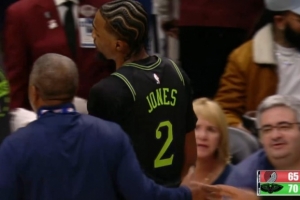 談驅(qū)逐,Petraitis: 瓊斯最初對一名裁判使用侮辱性語言,因此被吹罰第一次違反體育道德的技術(shù)犯規(guī)。隨后他繼續(xù)對兩名裁判使用侮辱性語言,從而導(dǎo)致第二次技術(shù)犯規(guī)并被驅(qū)逐出場。