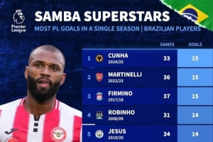 體育資訊12月13日訊 巴西球員英超單賽季進球排行榜出爐,24/25賽季庫尼亞33場15球排名第1,本賽季伊戈爾·蒂亞戈15場11球暫居第13。