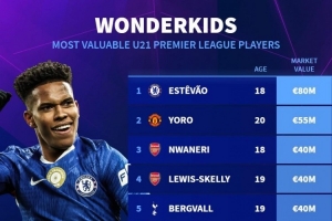 體育資訊12月13日訊 德國轉(zhuǎn)會(huì)市場(chǎng)列出了英超U21球員身價(jià)排名,埃斯特旺8000萬歐居首,約羅5500萬歐次席。