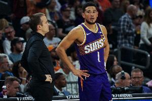 上半場(chǎng)比賽,復(fù)出的布克進(jìn)攻端投籃手感還需要調(diào)整,罰球也丟了兩個(gè),他出戰(zhàn)13分鐘,7中4,三分2中0,罰球4中2拿到10分1籃板2助攻1搶斷,正負(fù)值-6。