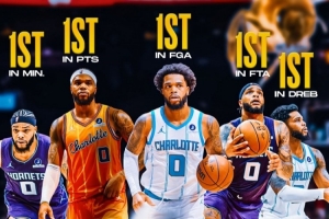 他在場(chǎng)均出場(chǎng)時(shí)間、總出場(chǎng)時(shí)間、總得分、場(chǎng)均得分、投籃出手?jǐn)?shù)、罰球出手?jǐn)?shù)、防守籃板總數(shù)等數(shù)據(jù)都是隊(duì)內(nèi)第一。