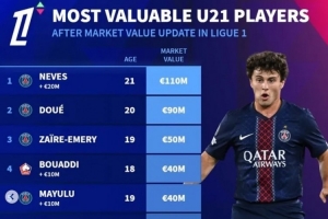 體育資訊12月15日訊 德轉(zhuǎn)更新了法甲球員身價情況,并列出了U21最貴身價榜,內(nèi)維斯壓杜埃居首。