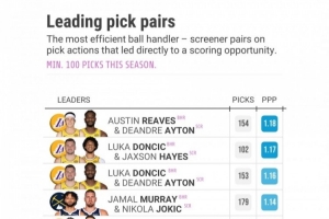 賽季至今,打過至少100次擋拆配合的二人組,效率最高的是里夫斯和艾頓,每回合1.18分,排在第2的是東契奇和海斯,每回合1.17分,排在第3的還是一對湖人組合,東契奇和艾頓,每回合1.16分。