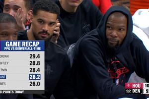 杜蘭特今天目前得到31分,最后時刻又回到場上,場均得分可能還會上漲。