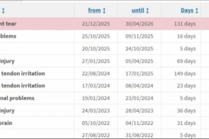 在2025/26賽季,遭遇感冒、小腿傷病和韌帶撕裂,預(yù)計(jì)缺席152天,預(yù)計(jì)錯(cuò)過23場(chǎng)比賽。