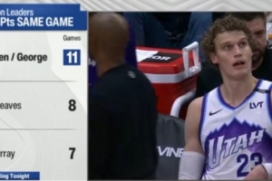 本賽季雙人組同場砍下25+場次,基昂特·喬治和馬爾卡寧11場領(lǐng)跑全聯(lián)盟,第二的是東契奇和里夫斯的8場,第三是約基奇和穆雷的7場。