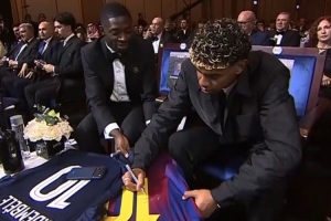 兩人在今年分獲金球獎前二,他們也在頒獎期間相互贈送了簽名球衣,不遠(yuǎn)處則是拉波爾塔、維蒂尼亞、伊涅斯塔等兩隊的知名人士。