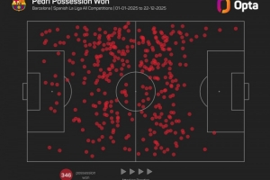 數(shù)據(jù)統(tǒng)計(jì)顯示,佩德里在2025年各項(xiàng)賽事共計(jì)346次奪回球權(quán),是五大聯(lián)賽同期非門將球員最多。