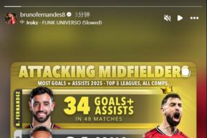 體育資訊12月29日訊 B費更新社媒,曬出自己在2025年五大聯(lián)賽進攻型中場進球+助攻數(shù)據(jù)的排名,他本人以35次進球+助攻位列榜首!