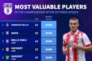 體育資訊10月6日訊 德轉(zhuǎn)更新英冠球員身價(jià),在目前的英冠球員身價(jià)中,南安普頓球員貝利斯和伊鎮(zhèn)球員戴維斯2200萬歐并列第一。