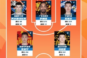 2025-2026賽季CBA聯(lián)賽常規(guī)賽第8輪結(jié)束較量,來自新疆廣匯籃球俱樂部的阿不都沙拉木 ,廣東宏遠籃球俱樂部的薩林杰,寧波富邦町渥男籃的羅凱文,深圳新世紀烈豹籃球俱樂部的賀希寧和浙江廣廈籃球俱樂部的孫銘徽入選CBA聯(lián)賽常規(guī)賽第8輪最佳陣容!
