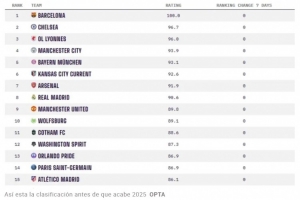 相比之下,男足的排名則有所不同。阿森納以滿分100分位居榜首,拜仁慕尼黑(98.2分)和曼徹斯特城(98.1分)分列第二和第三位。巴黎圣日耳曼(96.5分)和巴塞羅那(95.6分)也名列前茅?;始荫R德里男足目前排名第10,評分為93.4分,在最近一次更新中下降了兩個(gè)位置。切爾西(第8位,93.7分)和國際米蘭(第9位,93.6分)都超過了他們。